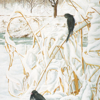 - Snowy nature scene with two birds hidden in the snow-filled trees.