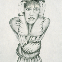 - Drawing of a woman clutching her hair in stress.