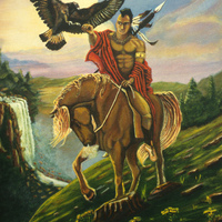- A native man riding a horse puts his hand out for a hawk to land on.