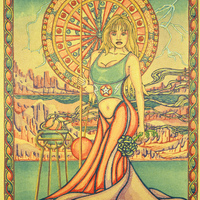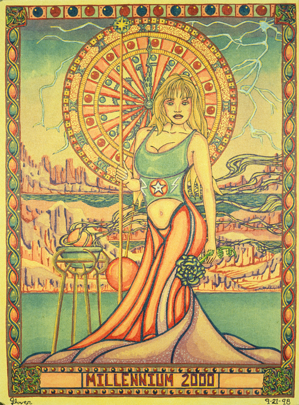 - A woman stands in front of fantasy themes representing the turn of the 21st century.