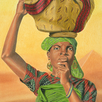 - Portrait of a woman carrying a basket on her head.