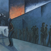 - People lined up in a science fiction setting.