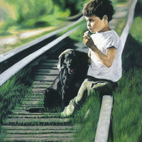 - A little boy sits on the train tracks next to his dog.