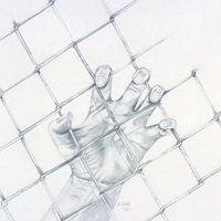 A hand gripping the fence.
