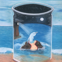 - Dolphin and a lighthouse inside of a jar on the sand.