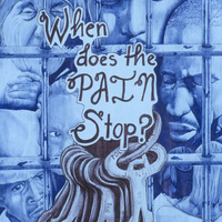 - Faces behind bars with "When does the pain stop" written out.