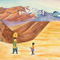 - Mother and child walk through a dessert.