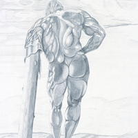 Backside of a muscular, nude man.