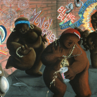 - Abstract people dance on the sidewalk.