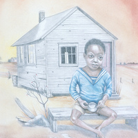 - A little boy sits outside his home.