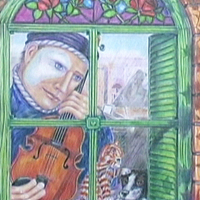 - A man clutching his violin admires his cat and dog.