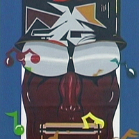 - Abstract portrait of a man in a hat and glasses. Music notes surround him.