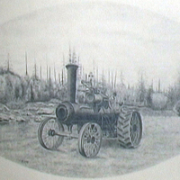- Drawing of a steam tractor in front of a field.