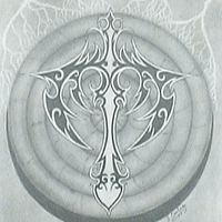 - Fiery cross in a circle with lightning bolts.