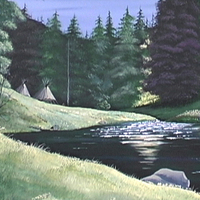 - Teepees in a tall forest next to a river.