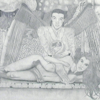 - A woman lounges under a handsome angel.