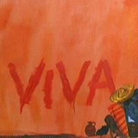 - Latino man sits below "viva" painted on the walls.