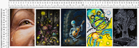 Harmonious Aspirations A figure of a man with an elightened third eye and the center of the body is a tree trunk, and the bottoms two snakes entwined. Roots grow around the chest, and balancing equally from the arms are baskets, one holding an anatomical human heart, and the other a feather. The composition is slplit in half, the baclground to the left is a lush filed and blue skies and water, the right is a desert and barren land, with a grey sky and sea.