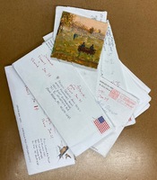 Amphibians 7 frogs sit on lily pads on a pond. A swarm of mosquitoes create the shape of a heart in the puffy clouds above.