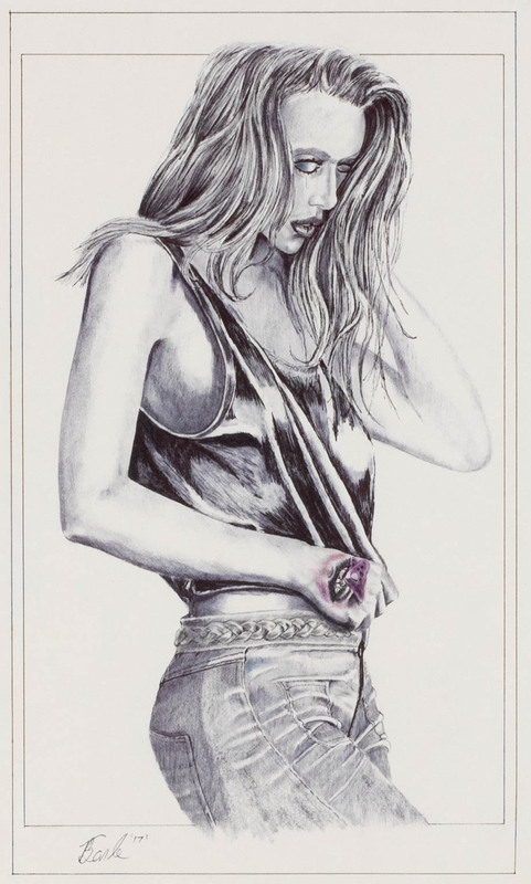- A woman is standing sidewars facing the right, with her face tilted down she is looking up, and one hand is on her long straight hair, the other pulling at a sleeveless tank top. She is wearing tight jeans, a braided belt, and has a tattoo of a pair of lips biting somthing.