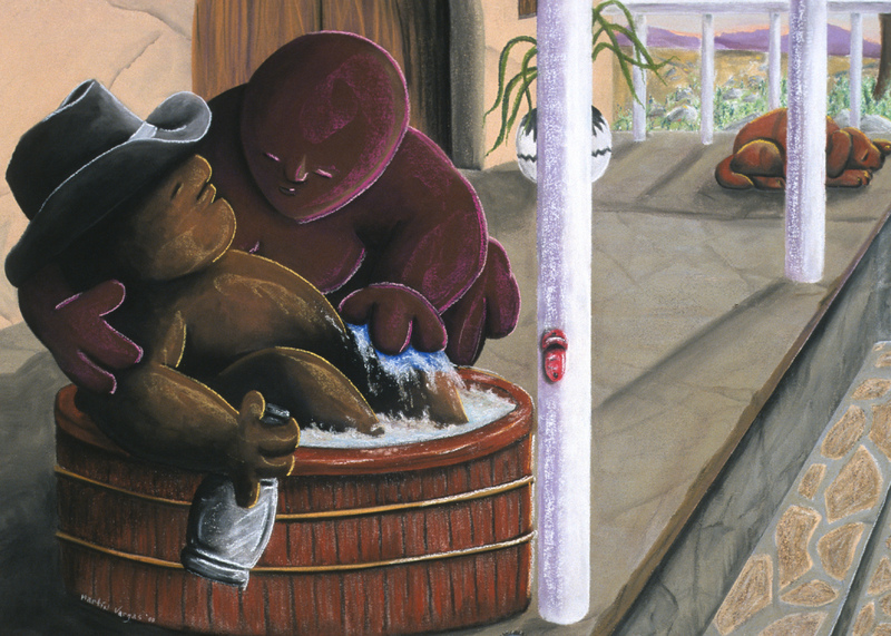 - A drunk cowboy in a bathtub is held by another person.
