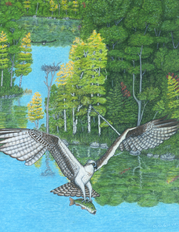 - An osprey catching a bass over a lake.