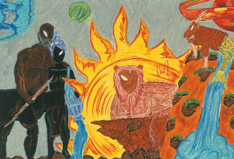 - A centaur and a woman stand next to the sun surrounding a lion.