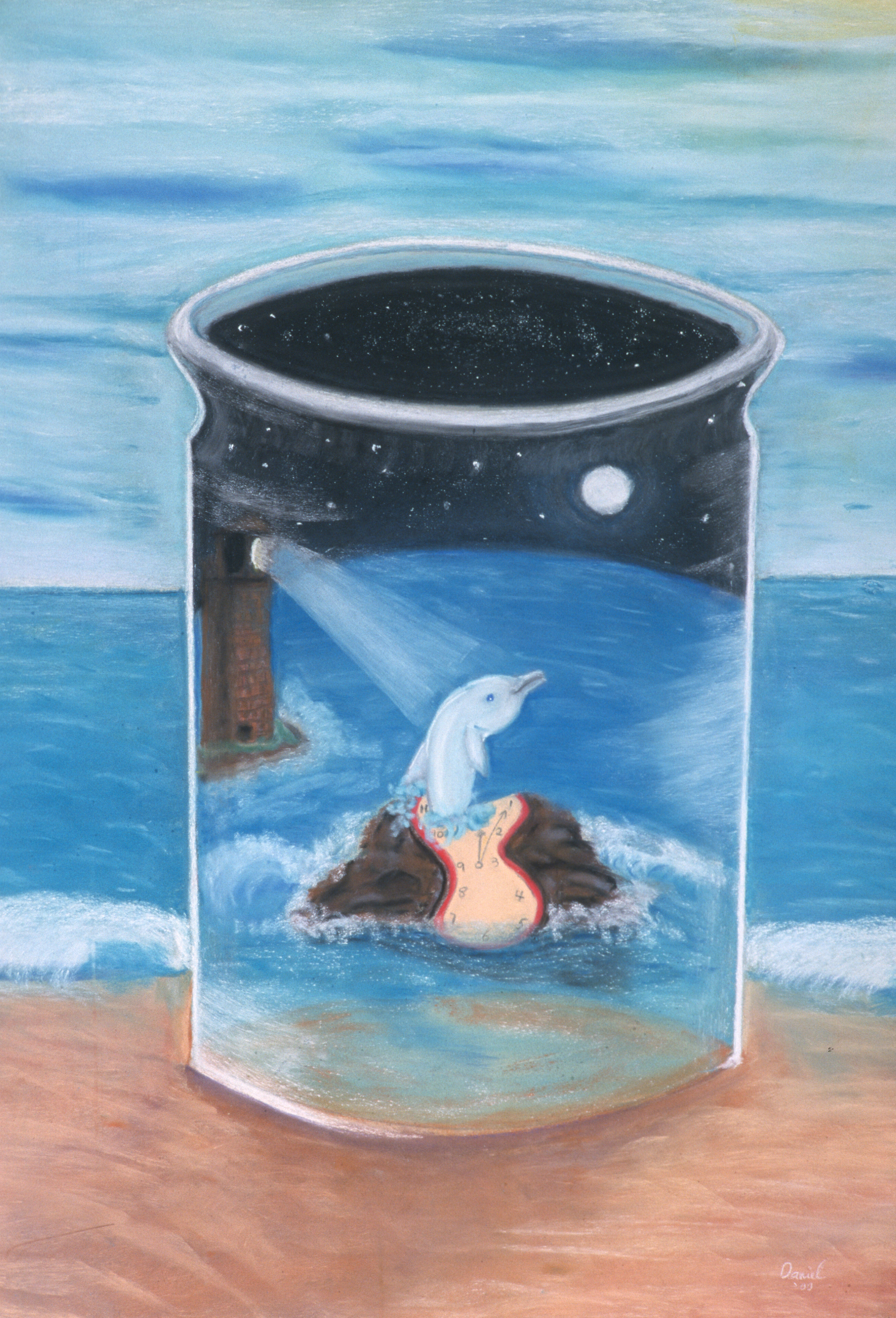 - Dolphin and a lighthouse inside of a jar on the sand.