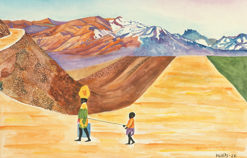 - Mother and child walk through a dessert.