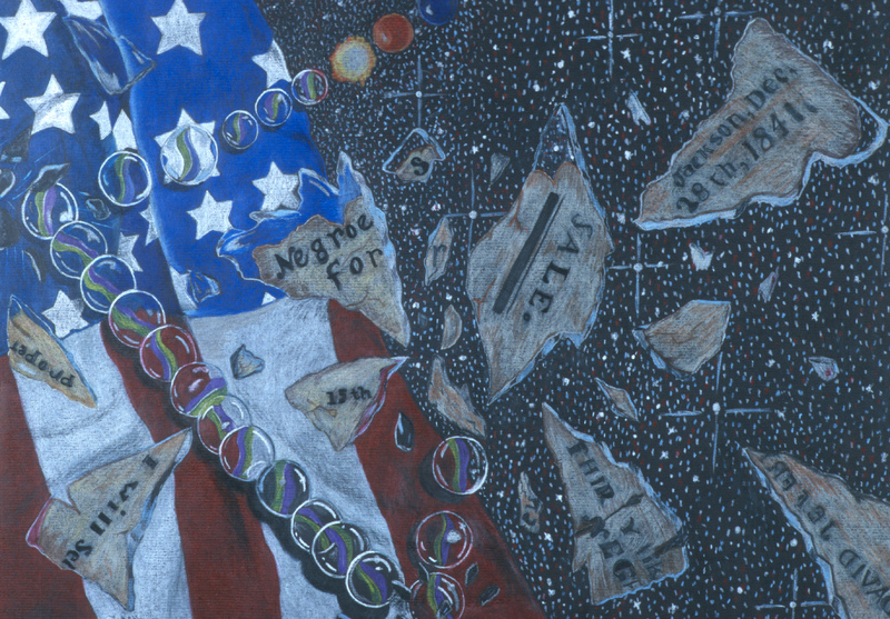- Ripped up newspaper article with broken glass scattered over an American flag.