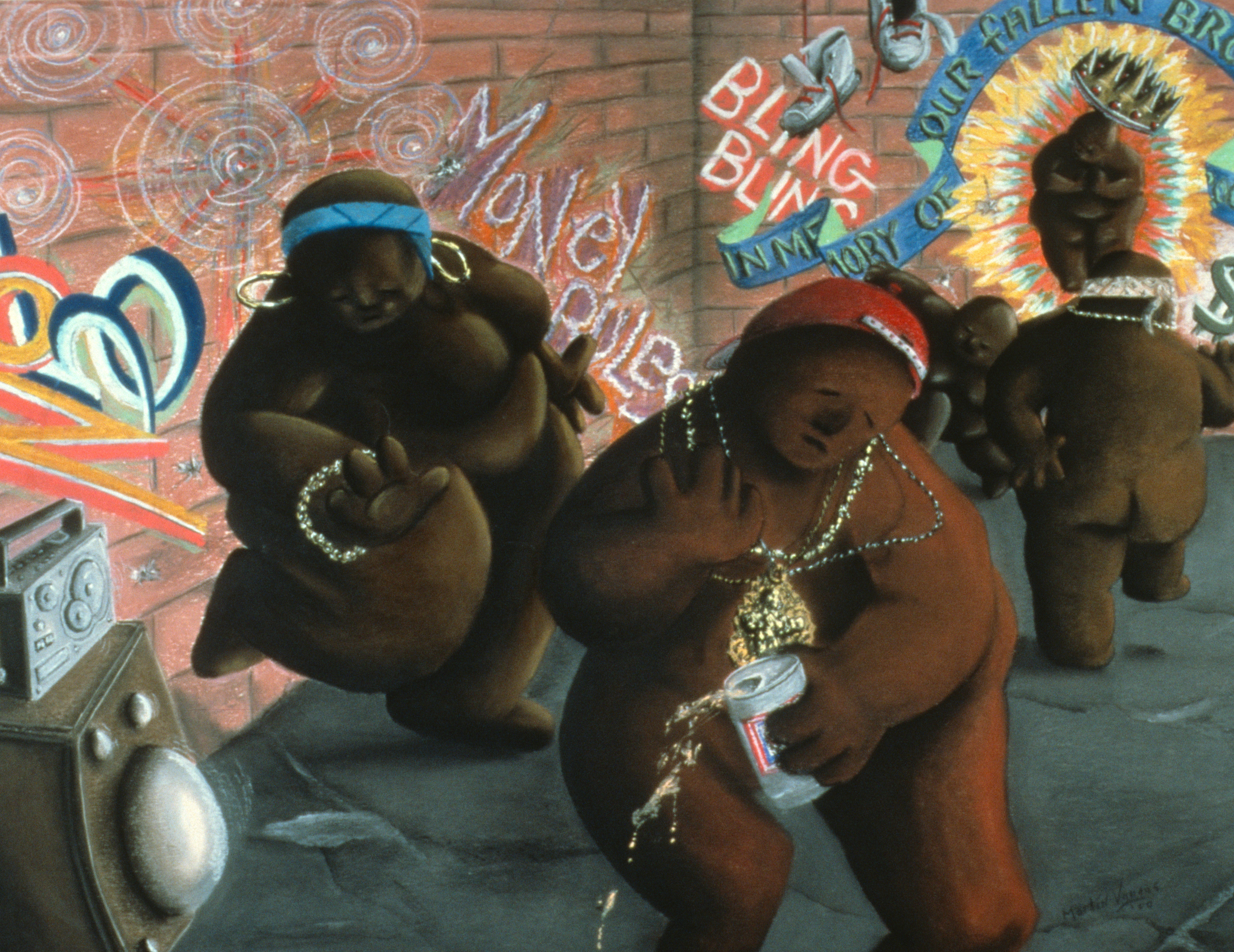 - Abstract people dance on the sidewalk.