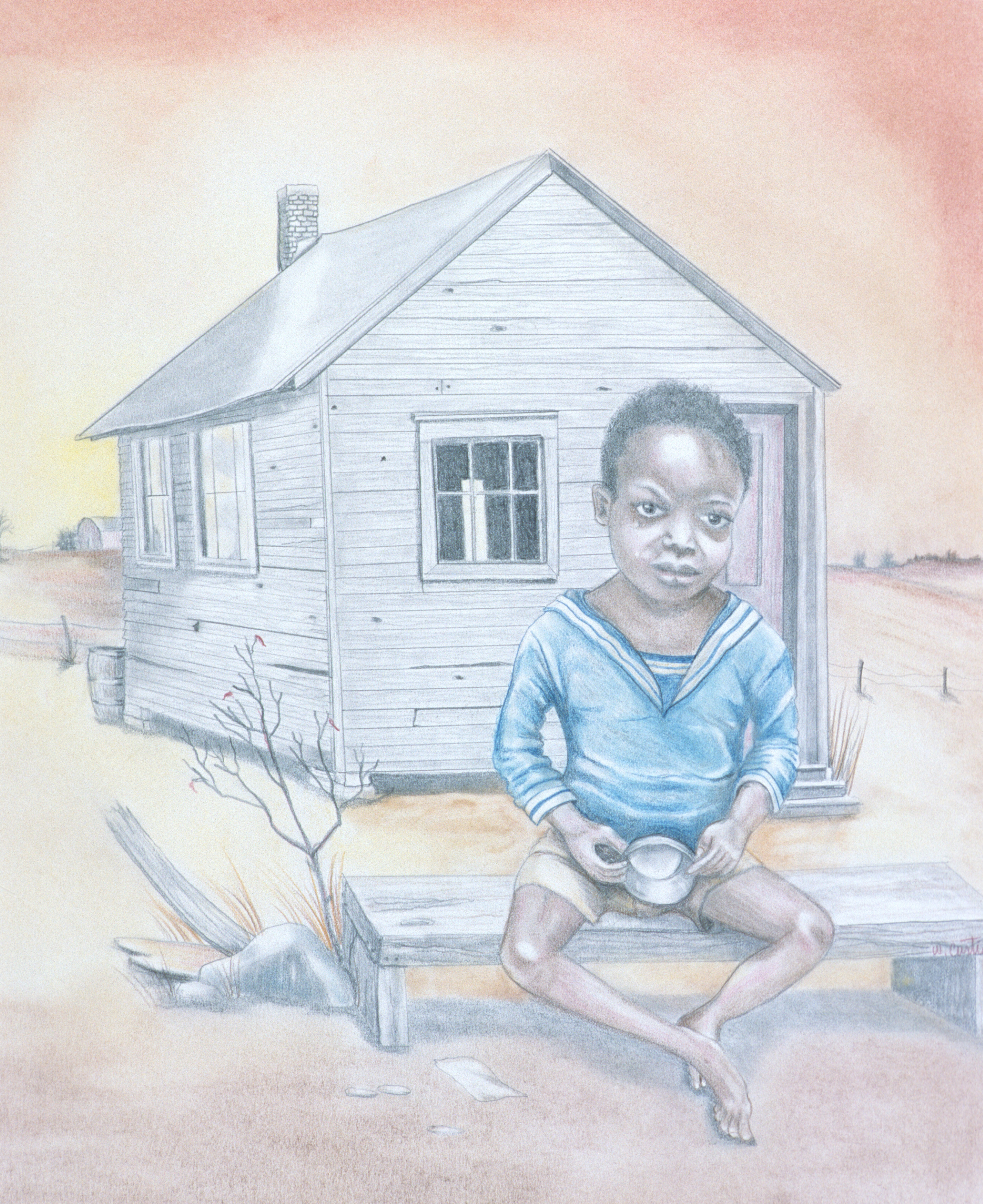 - A little boy sits outside his home.