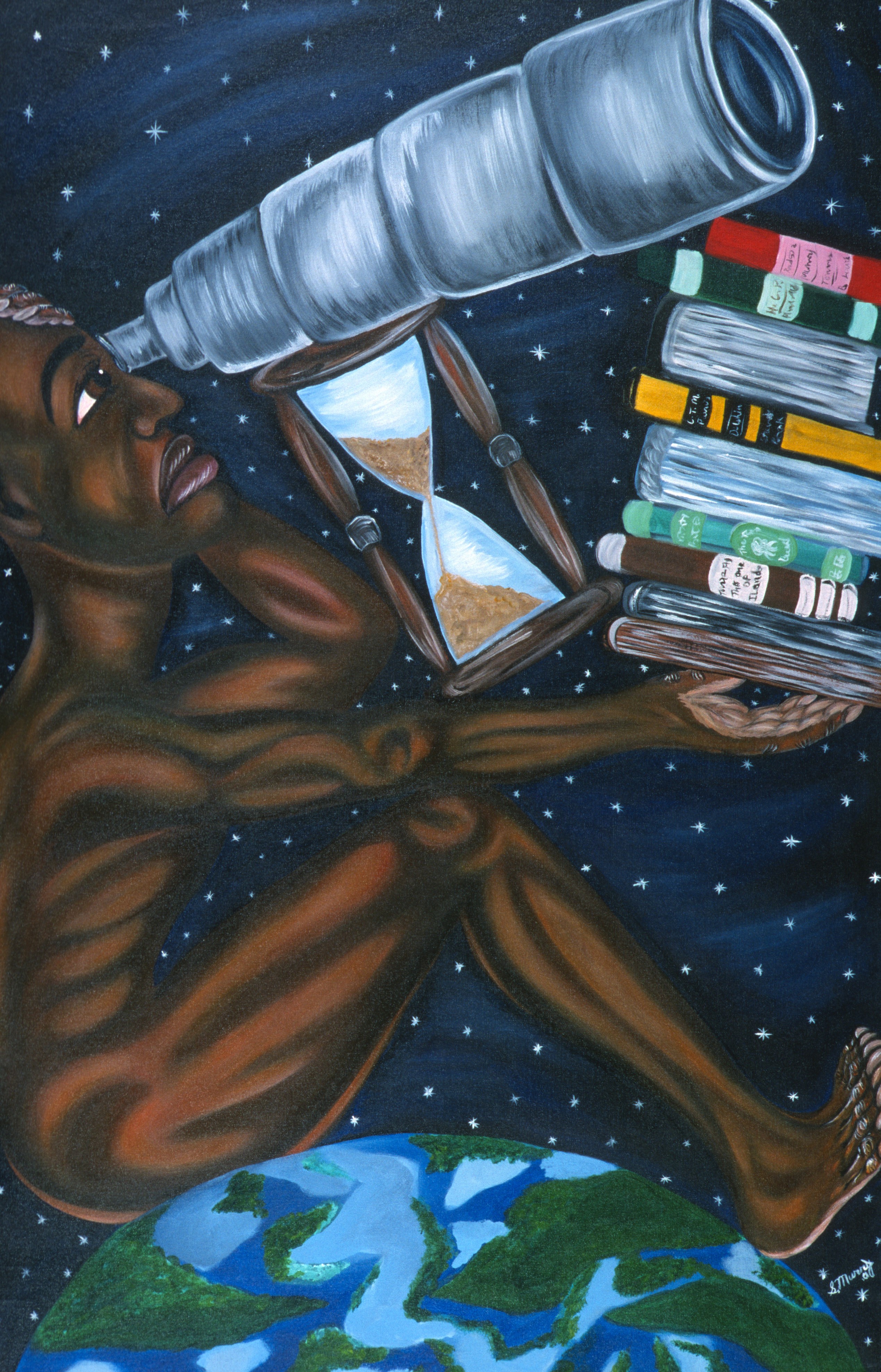 - A man sitting on Earth looks at space through a telescope and is holding books.