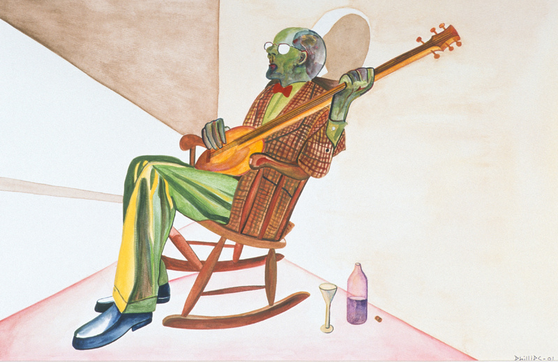 - Green man sitting in a chair playing his guitar.