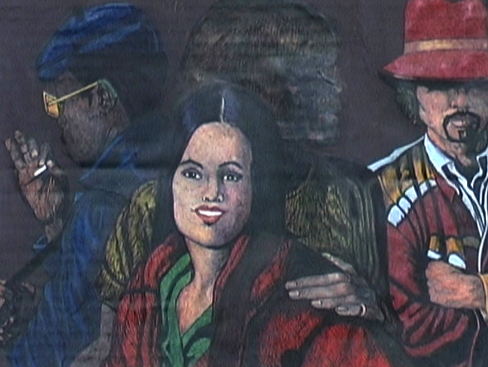 - A woman smiling between two mysterious men.
