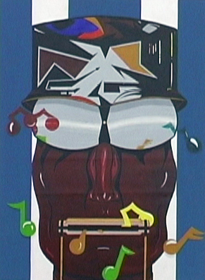 - Abstract portrait of a man in a hat and glasses. Music notes surround him.