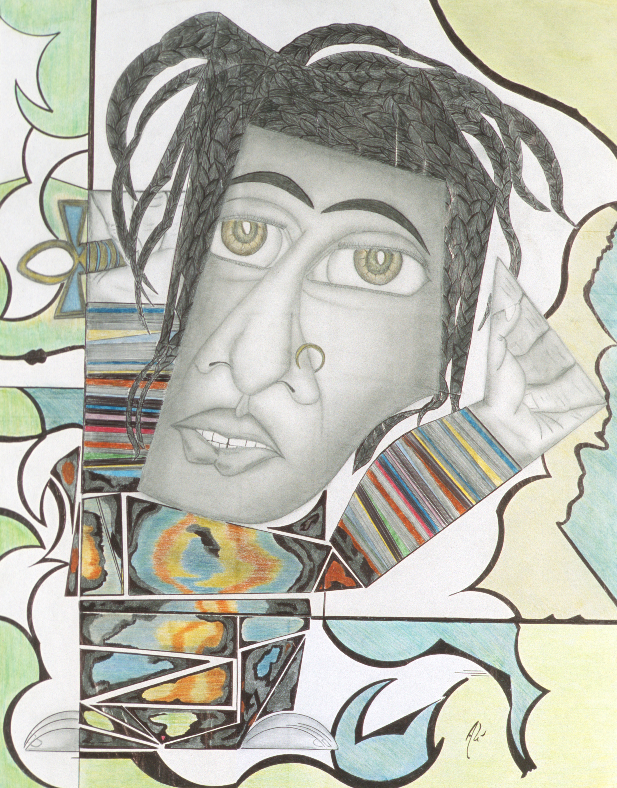 - pen, colored pencil, and ink