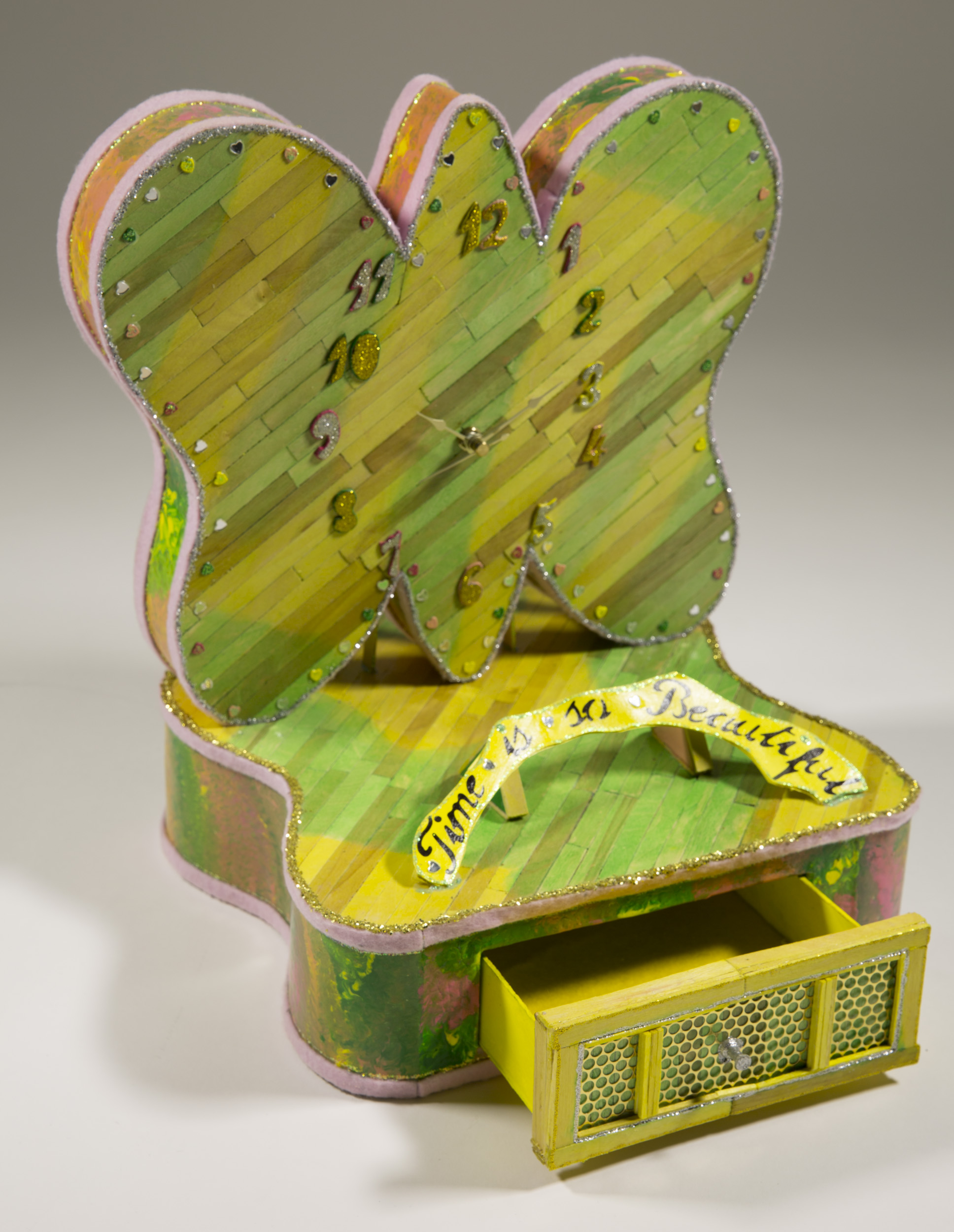 - Cardstock, chipboard, glitter glue, Mod Podge, push pins, paint, clock, stick wood felt