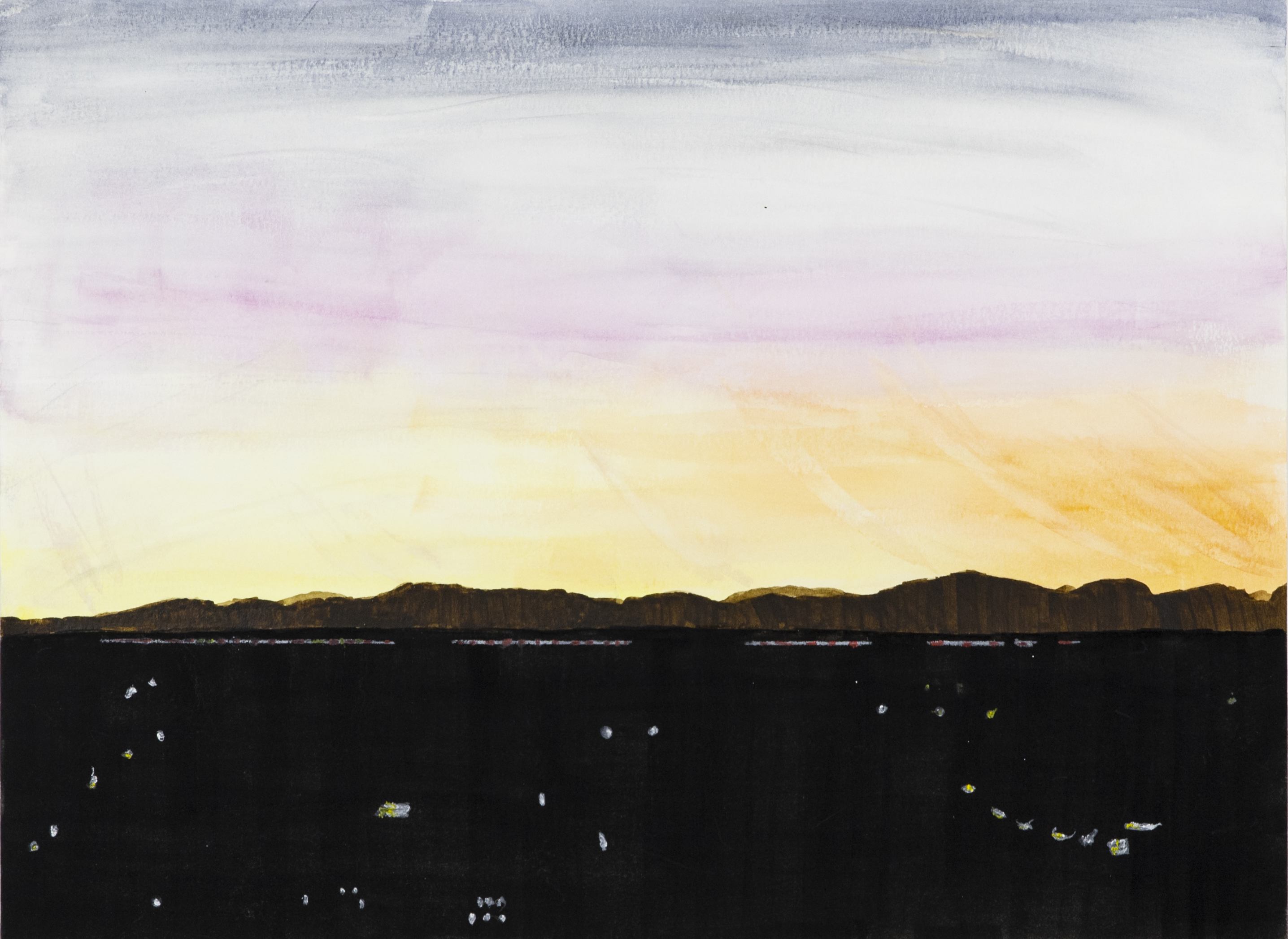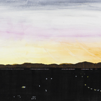 - Painting of a city (Salt Lake City) at night. Dark foreground, with sporadic lights indicate the city. A mountain range in the background is lit by a sunset.
