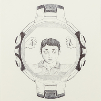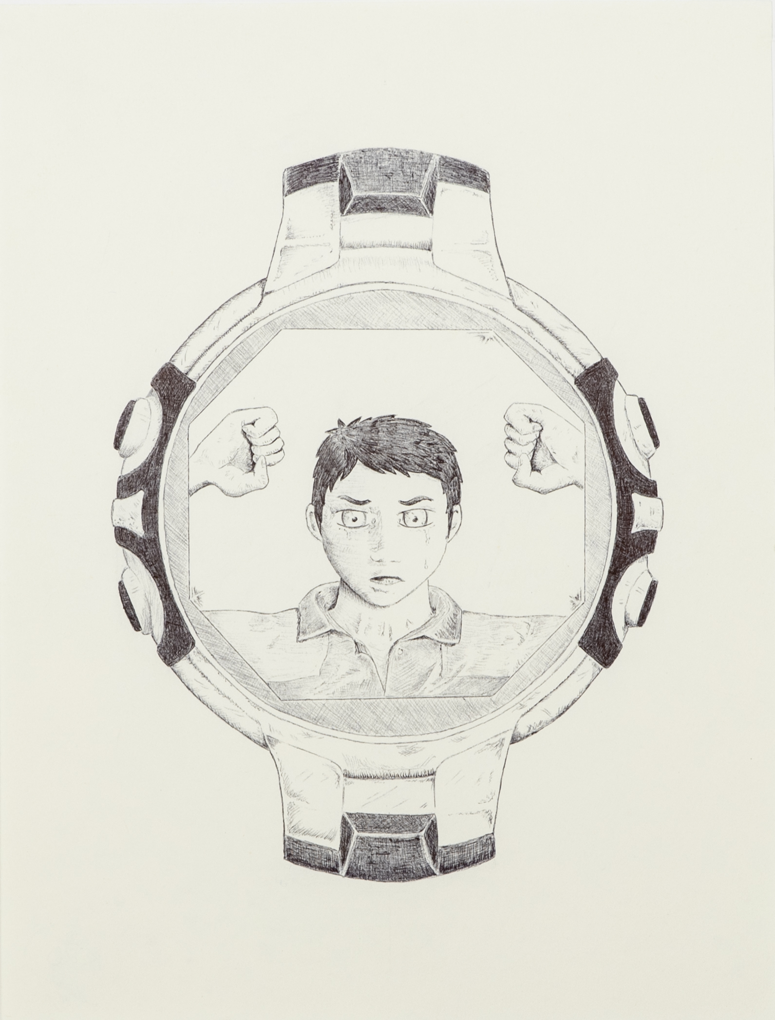 - Black and white image of a man stuck behind the face of watch, crying, his fists against the glass.