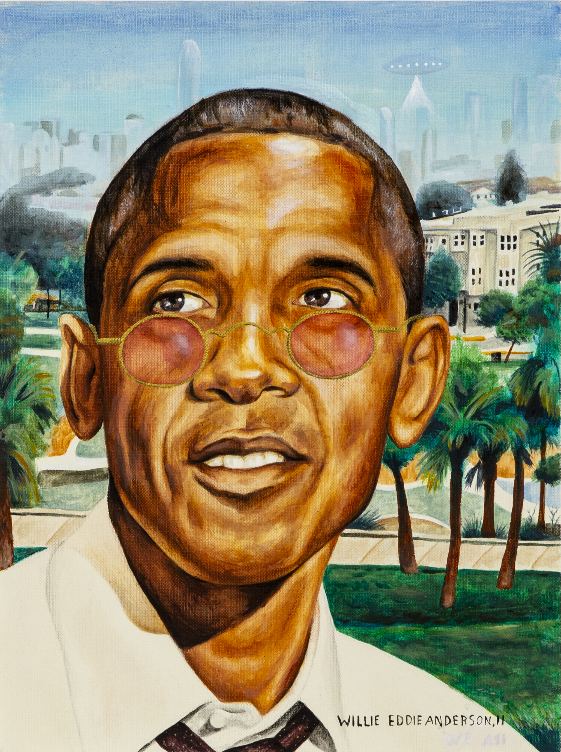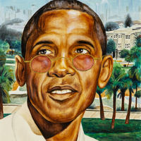 - Color portrait of Obama wearing red tinted sunglasses standing in front of a cityscape.