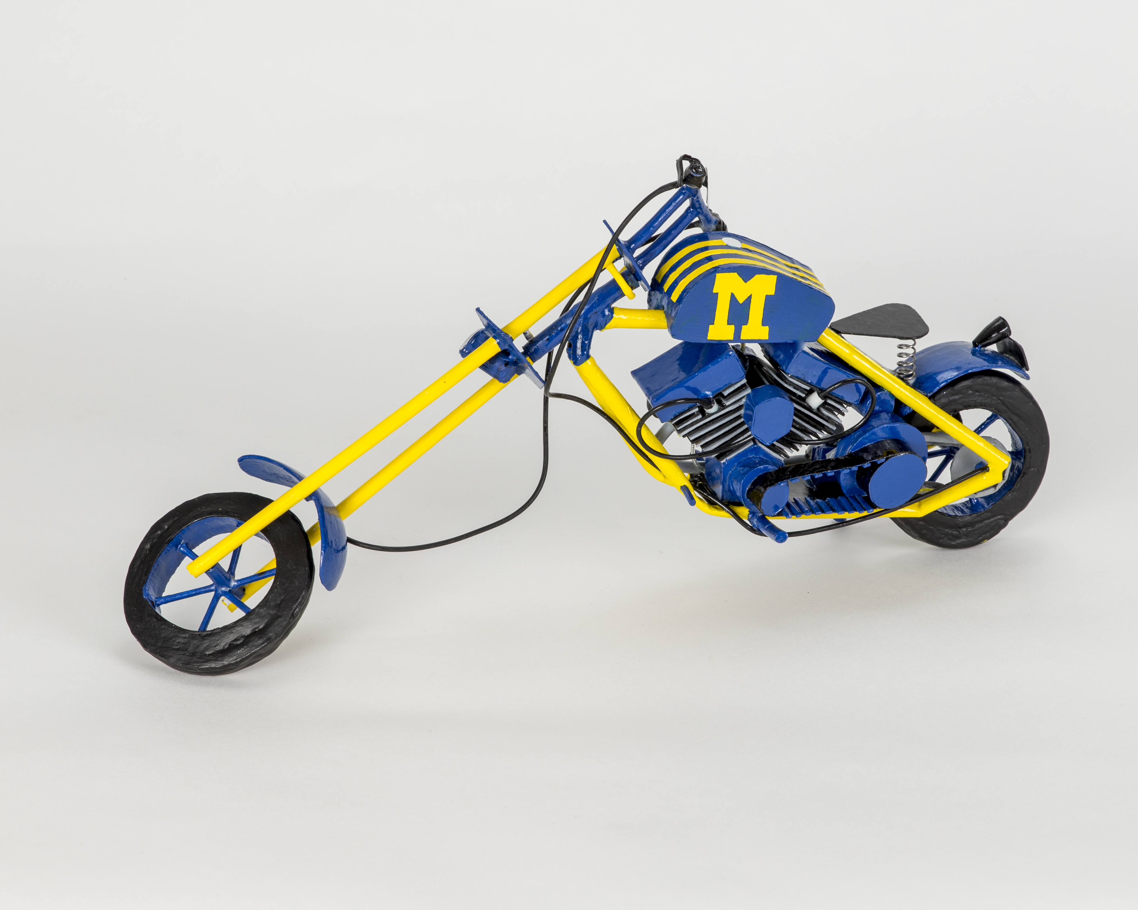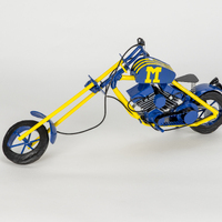 - Built blue and maize motorcycle with a block M on the body.