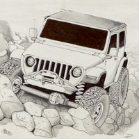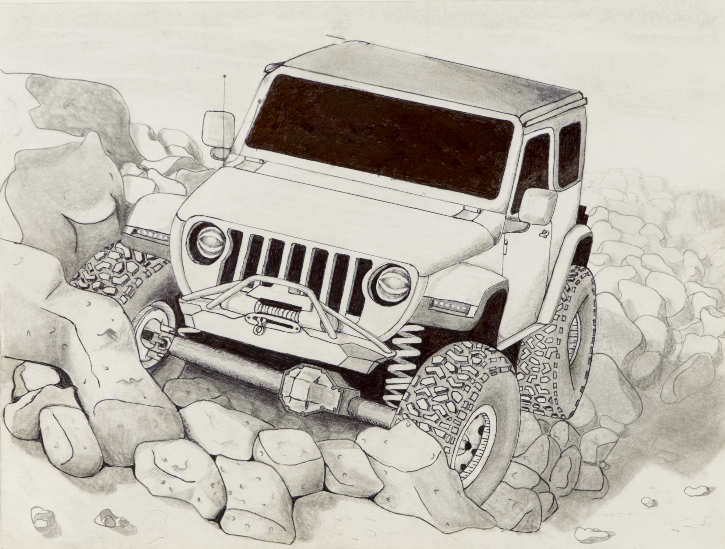 - Black and white image of a jeep like car with a lift kit driving over rocky terrain.