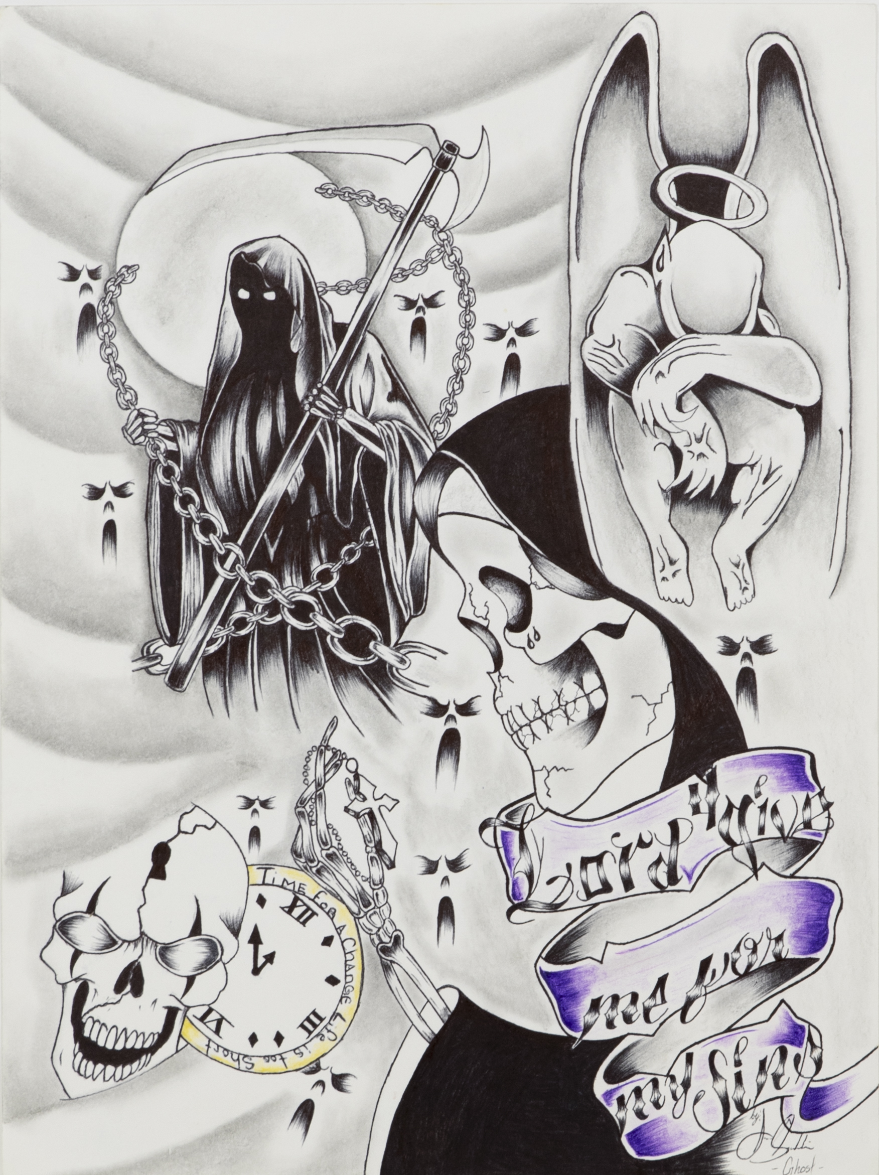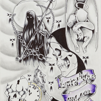 - Drawing in the Tattoo style of a Grim Reaper carrying chains, a robed skeleton looking at a a cross in his hands, an angel with his head reseted on his legs, a skull, and a clock that says "time for a change life is too short" around its edge. All of this sits on a background of shaded, rounded lines and are surrounded by faces with dark eyes and open mouths.