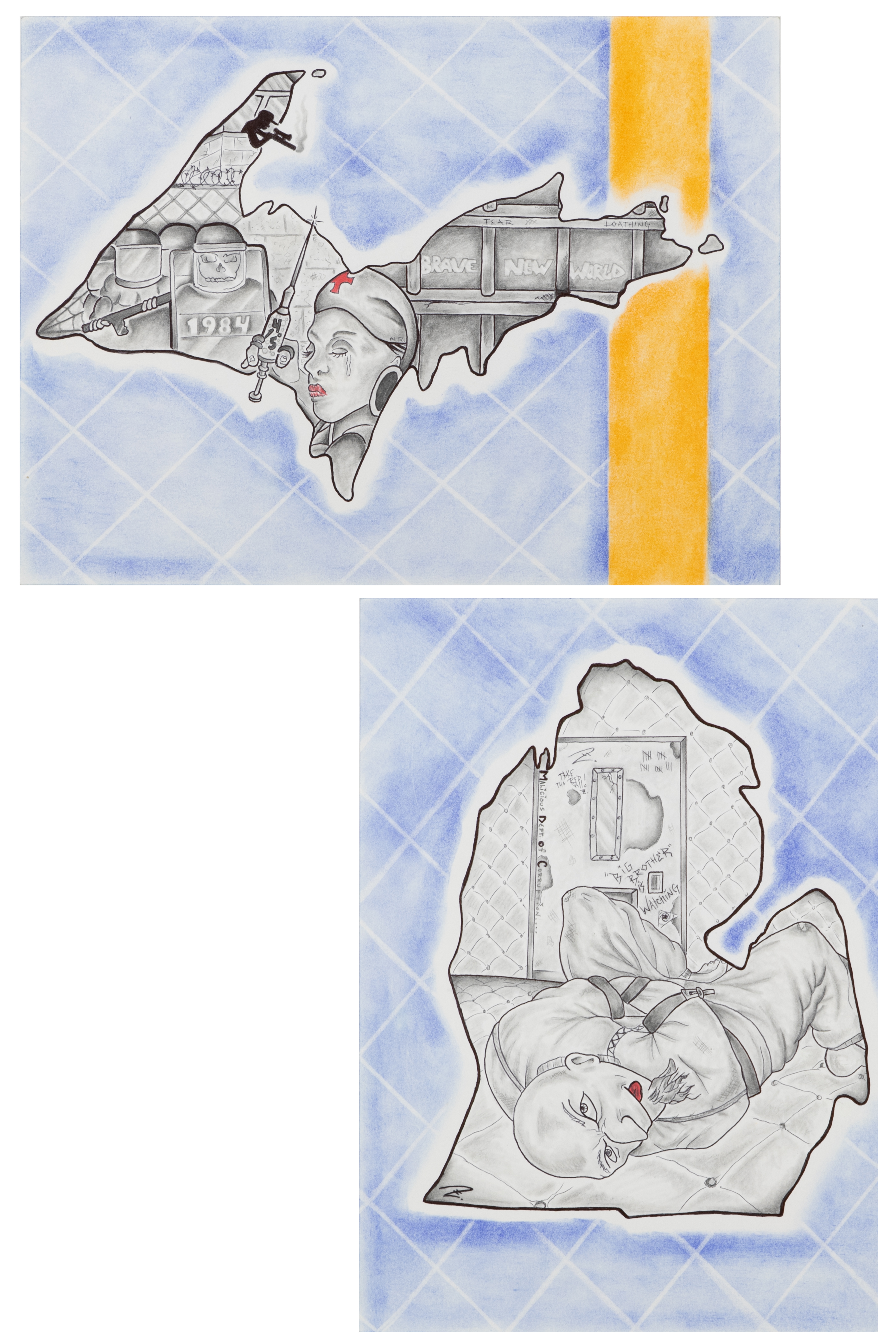 - Drawing of the Upper Peninsula of Michigan, filled with imagery of prison/riot guards, a nurse with a syringe, and prison bars that have the words "Brave New World" between them and "Fear" and "Loathing" written on them. Behind the Upper Peninsula outline is a chainlink fence rendered in the colors of the prison uniform (blue and orange).