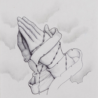 - Drawing of hands, clasped in prayer, holding a rosary and intertwined with a ribbon. The hands are surrounded by clouds.