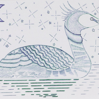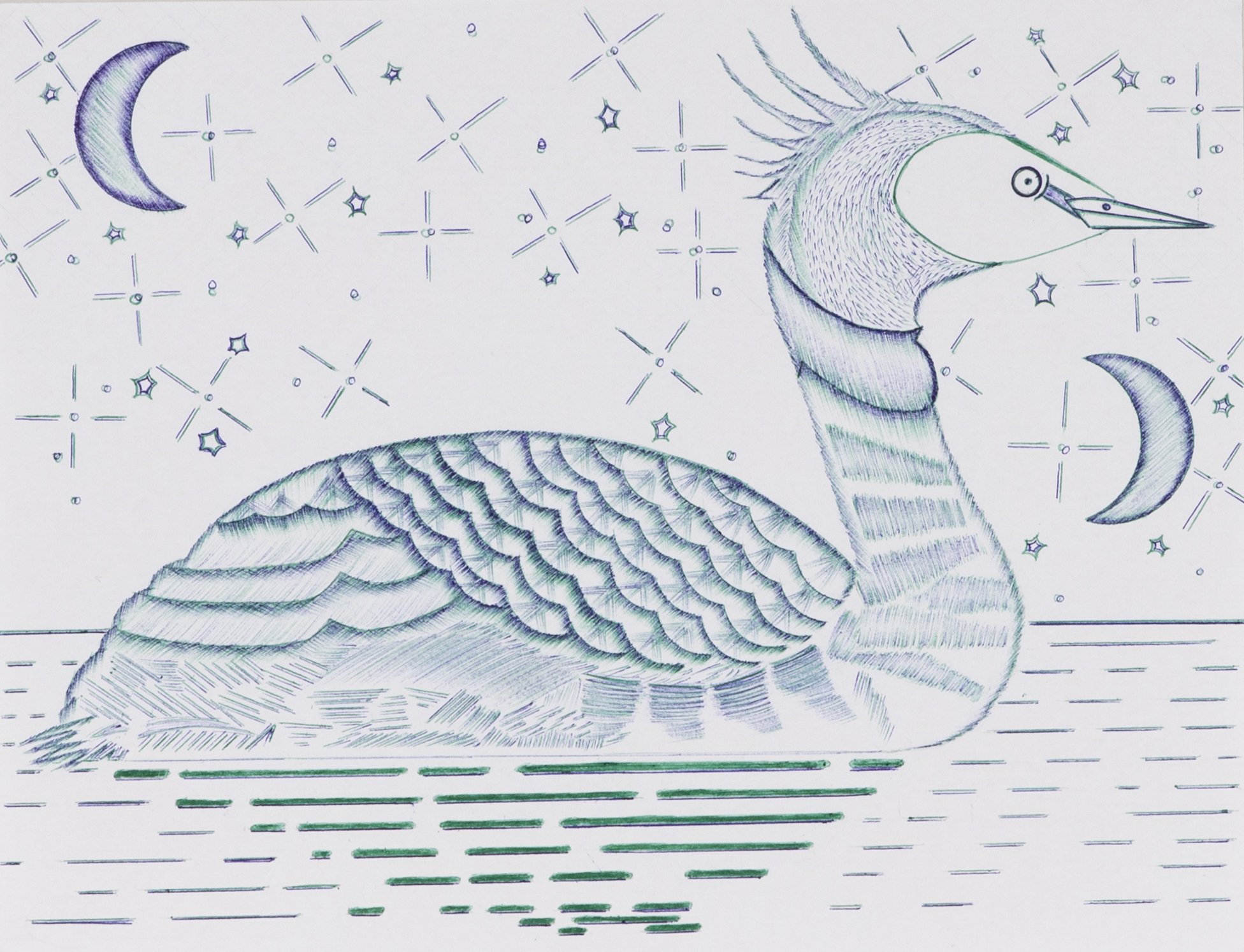 - Drawing of a duck floating on water, in blue and green. In the sky behind it are two moons and several stars.