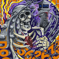 - Color image of a skeleton with a living heart, wrapped in barbed wire, with prison bars going through it. The background is comprised of purple and orange swirls surrounding a prison guard tower with the word "DOC" and and numbers "256263" incorproated into the swirls.