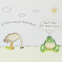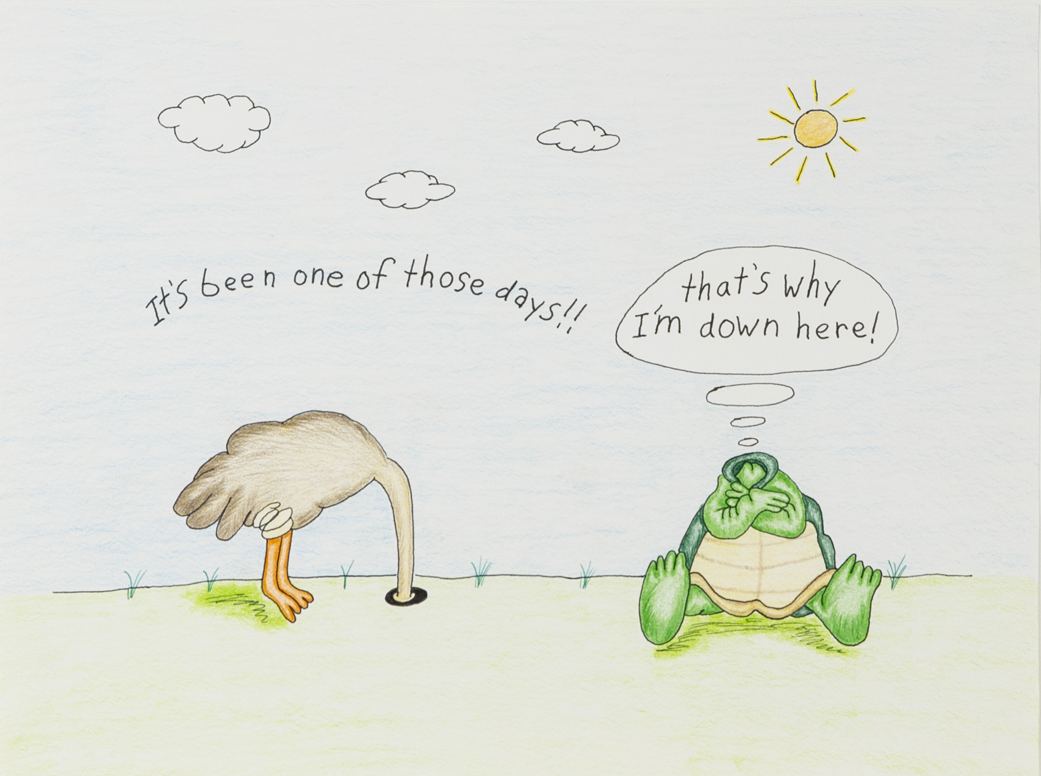 - Color image of a bird, its head stuck in a hole in the ground and text above it saying "It's been one of those days!!", and a turtle, it's head in it's shell and a speech bubble saying "Thats why I'm down here". The background features green grass and a blue sky, with a yellow sun.