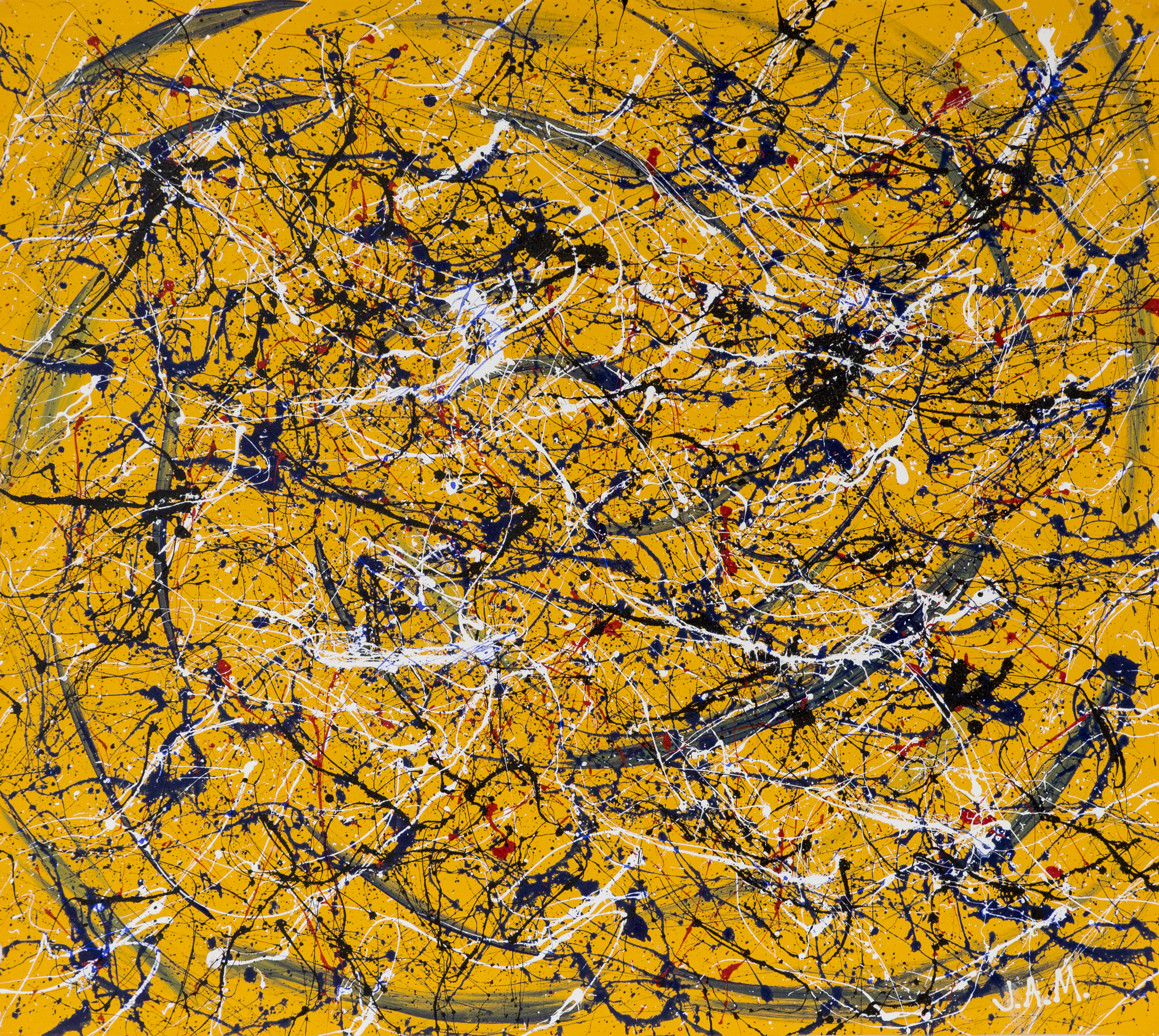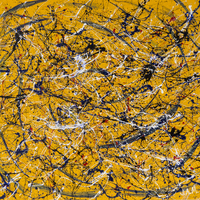 - Color splatter art in whites, reds, and blues on a yellow background.